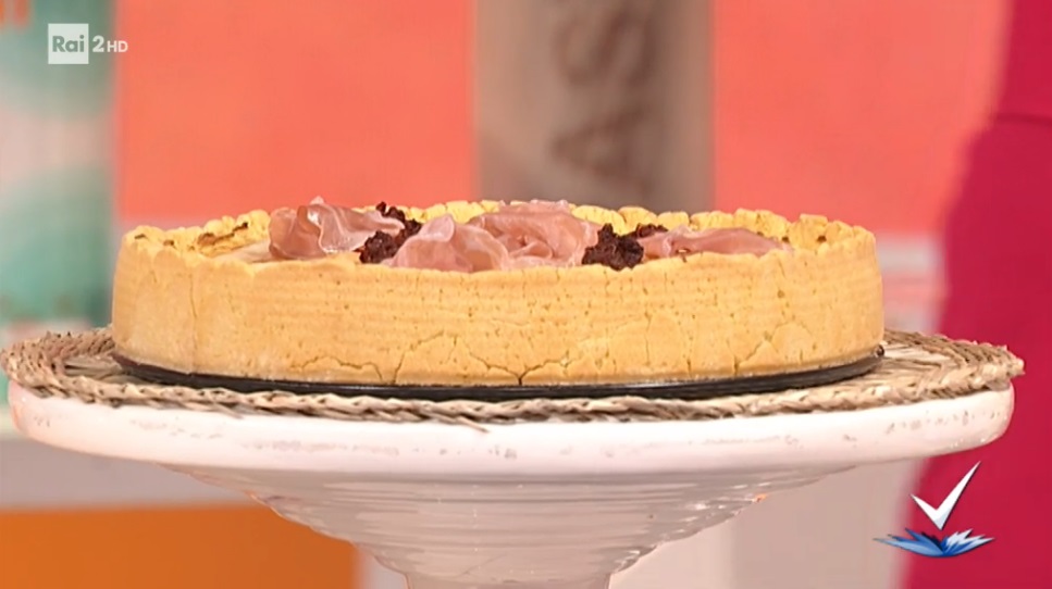 Stendiamo la frolla salata ad uno spessore di 3-4 mm e la posizioniamo all’interno di una tortiera unta d’olio, in modo da coprire fondo e bordi. Spalmiamo sul fondo metà del composto di patate; lo livelliamo e distribuiamo sopra la cipolla rossa affettata finemente, il prosciutto affettato, le olive denocciolate e parte della ‘nduja a fiocchetti. Copriamo il tutto con il composto di patate rimasto. Cuociamo in forno caldo e statico a 200° per 30 minuti. Tiriamo fuori dal forno e distribuiamo sopra la ‘nduja rimasta ed il caciocavallo a scaglie. Inforniamo nuovamente per 3-4 minuti. Sforniamo e serviamo con altro prosciutto crudo.