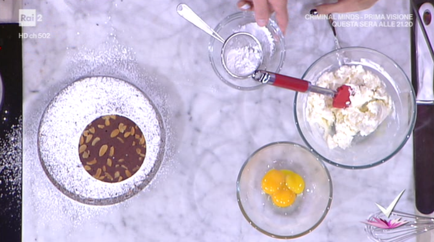 Per la crema: in un pentolino portiamo a bollore lo zucchero con un goccio d’acqua. Quando il composto raggiunge i 121°, lo versiamo a filo sui tuorli che abbiamo iniziato a montare con le fruste elettriche qualche minuto prima. Montiamo fino ad ottenere un composto chiaro e consistente e fino al completo raffreddamento. Uniamo il mascarpone e montiamo ancora con le fruste elettriche, fino ad ottenere una crema spumosa e vellutata. Serviamo la torta con la crema.