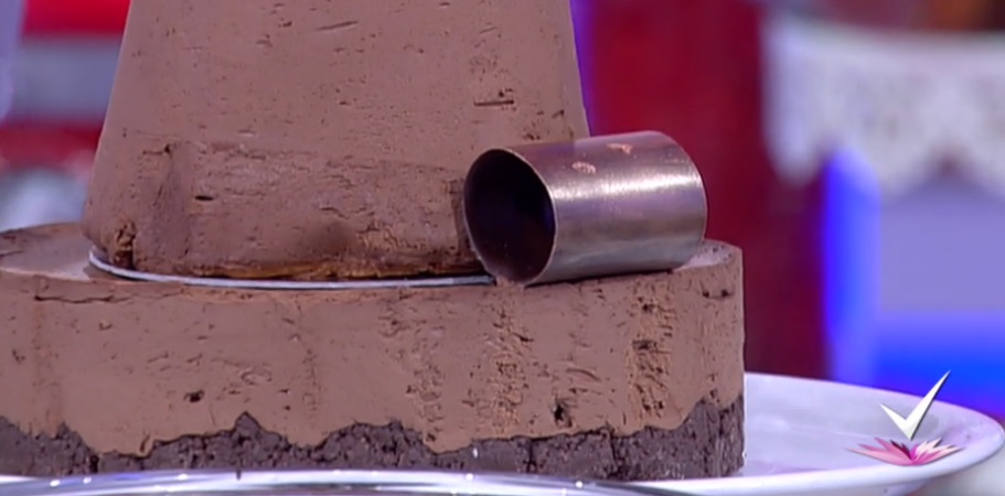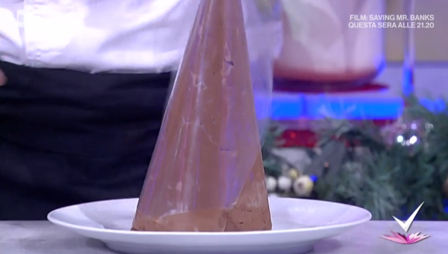 La mousse rimasta, invece, la versiamo all’interno di un cono ottenuto arrotolando su se stesso un foglio di acetato. Lasciamo indurire per 2 ore in frigorifero o freezer. Poggiamo il cono di mousse sulla torta ben fredda.