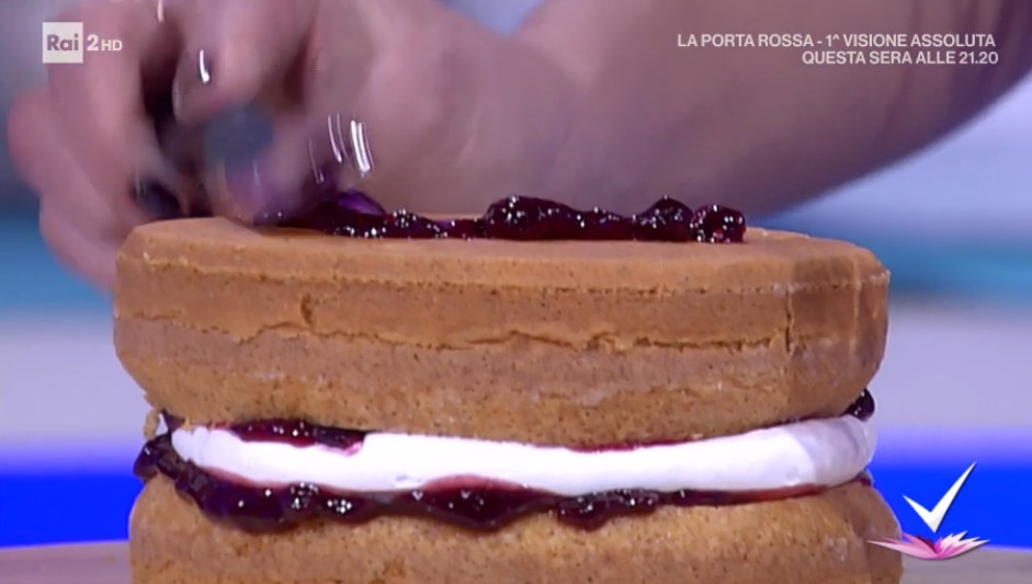 Montiamo la panna. Spalmiamo sul primo pan di Spagna uno strato di marmellata ai frutti di bosco. Formiamo sopra uno strato di panna montata. Sovrapponiamo, capovolgendolo, un altro pan di Spagna e proseguiamo come prima. Spalmiamo la superficie ed i lati con la panna rimasta, lasciando che si intravedano gli strati.