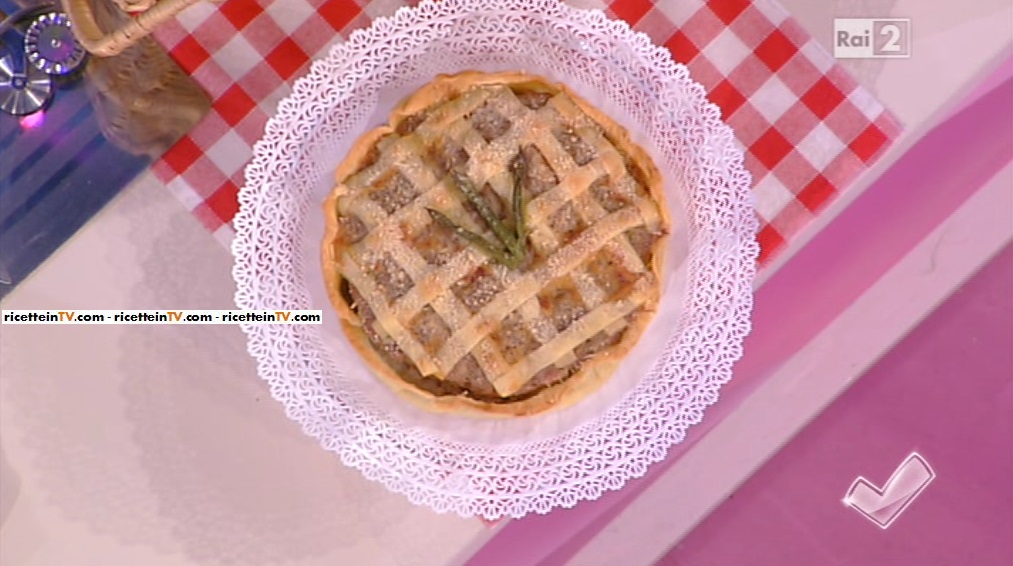 Macinare due volte i tre tagli di carne. Bagnare 200 g di mollica di pane in 50 ml di latte. Amalgamare alla carne, la mollica di pane bagnata, un uovo, il grana, il sale. Sbollentare gli asparagi e tagliateli (se li bollite in pentola, lasciateli in cottura per 20 minuti in modo che siano croccanti e non troppo morbidi. Altrimenti usate una vaporiera). Disporre una sfoglia rotonda su una teglia foderata con la carta forno. Dividere l’impasto in due e usare la prima per farcire la base della sfoglia. Adagiare sopra il primo strato di impasto delle fette di uova sode tagliate con la mandolina e le punte di asparagi. Pressare la seconda parte dell’impasto sul precedente ricoprendolo. Tagliare le listarelle di pasta sfoglia dalla seconda sfoglia e disporle sull’impasto. Decorare con le punte di asparagi e una spolverata di grana. Infornare per 40 minuti a 180° in forno preriscaldato ventilato coprendo la torta con carta stagnola (usiamo questo accorgimento per permettere alla carne di cuocere evitando però di bruciare la pasta sfoglia). Al termine dei 20 minuti estrarre dal forno, rimuovere la carta stagnola e cuocere stavolta a 160° per 15 minuti.