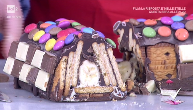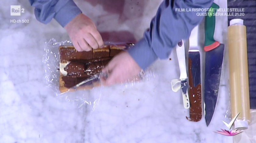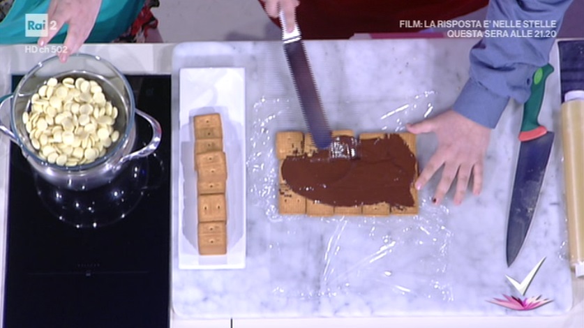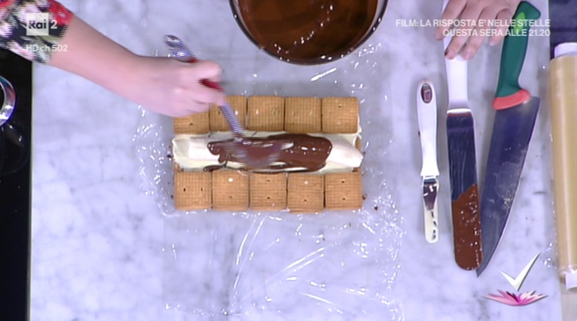 Su un foglio di pellicola, creiamo una base di biscotti secchi (5 x 3 biscotti). Spalmiamo sopra un po’ di cioccolato fondente, in modo da ‘incollare’ i biscotti tra loro. Sovrapponiamo un altro strato di biscotti. Stavolta, li copriamo con il cioccolato bianco fuso, che spalmiamo per bene con una spatolina. Sulla striscia centrale di biscotti, quindi, adagiamo le banane pelate. Ai lati, invece, continuiamo con un altro strato di biscotti. Copriamo la banana ed i biscotti col cioccolato fondente. A questo punto, avvolgiamo i lati sulla banana, chiudendo la pellicola a caramella. Otterremo una sorta di trapezio. Mettiamo in freezer per 30 minuti.