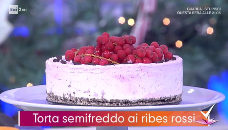 Versiamo la crema ottenuta sulla base fredda. Livelliamo con una spatola e mettiamo in freezer per 4 ore. Una volta congelata, decoriamo con gocce di cioccolato e ribes freschi.