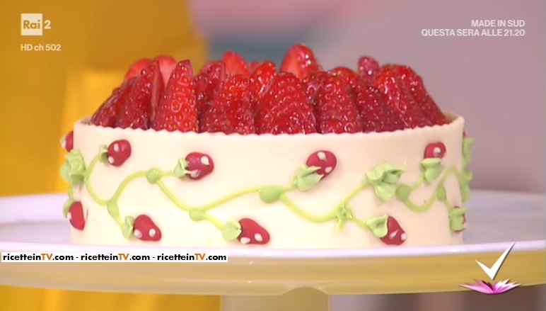 Tagliamo il pan di Spagna in due dischi da 18 cm di diametro. Inseriamo in un anello foderato con acetato dello stesso diametro il primo disco. Lo bagniamo con la bagna alla vaniglia. Formiamo un generoso strato di crema. Copriamo con un altro disco, lo bagniamo e lo glassiamo con altra crema. Decoriamo con fragole fresche e, se vogliamo, copriamo i lati con un anello di cioccolato bianco plastico.
