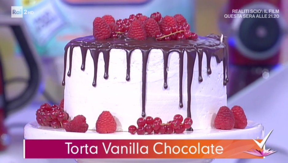 - 400 g farina, 400 g zucchero, 6 cucchiai di cacao in polvere, 2 cucchiaini di bicarbonato, 470 ml acqua, 70 g gocce di cioccolato, 10 cucchiai di olio di semi, 2 cucchiai aceto, 2 cucchiaini di estratto di vaniglia, lamponi e frutti di bosco