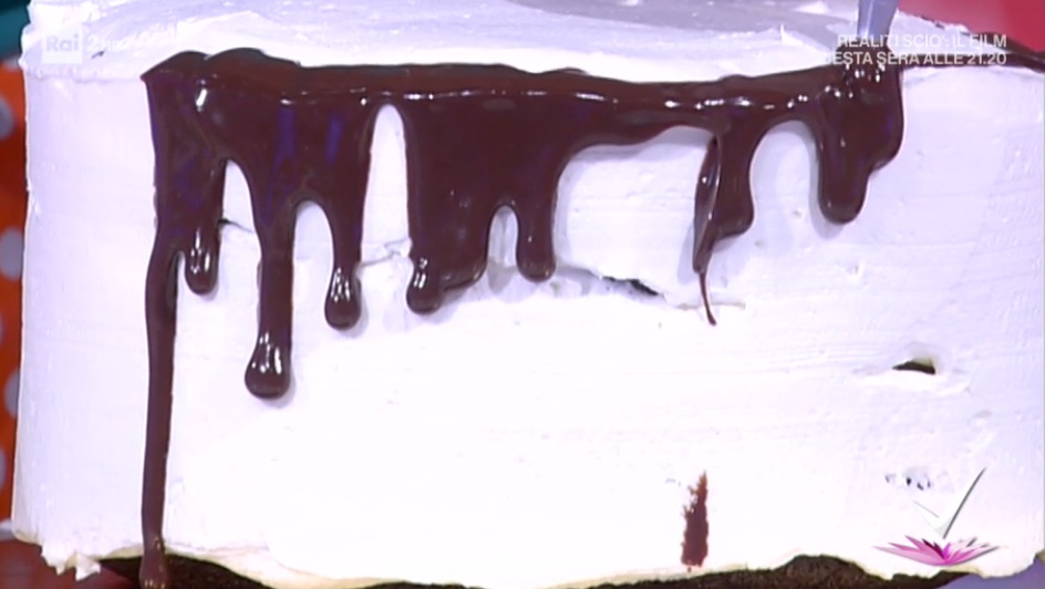 Coliamo la glassa sulla superficie della torta, facendola scendere anche sui bordi. Decoriamo con i frutti rossi.
