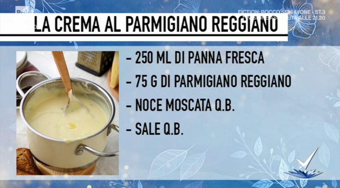 - per la crema al parmigiano: 250 ml di panna fresca, 75 g di parmigiano reggiano, noce moscata qb, sale qb