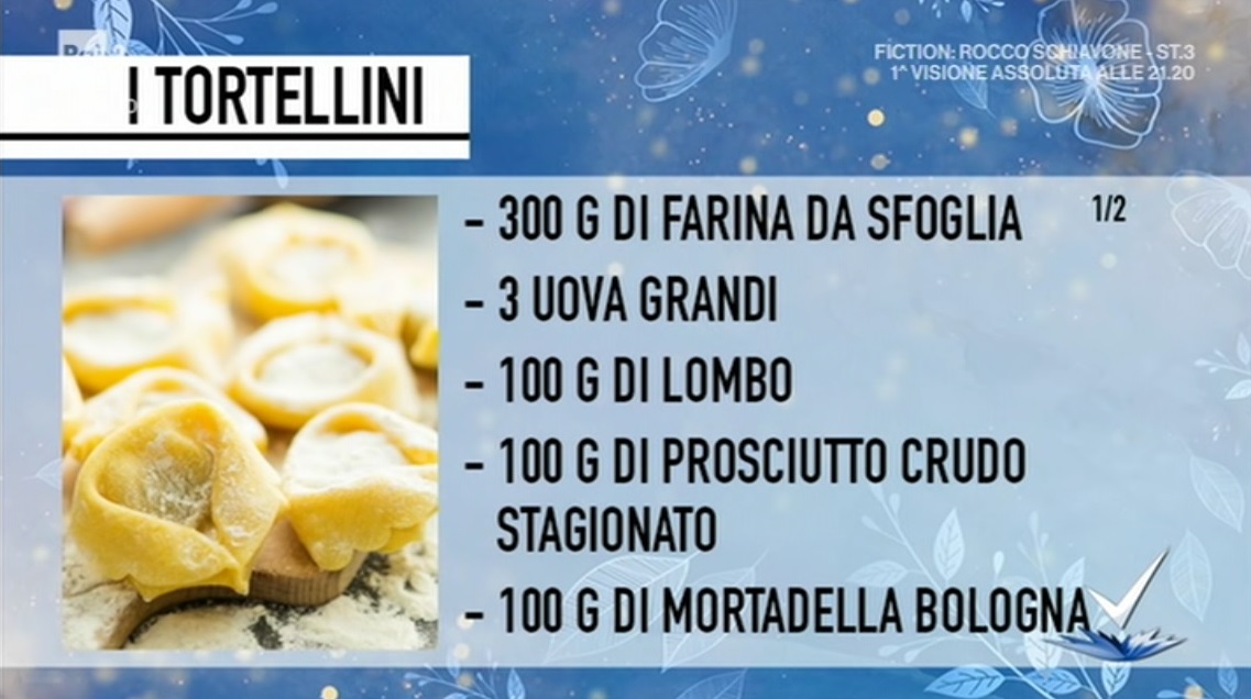 - per i tortellini: 300 g di farina da sfoglia, 3 uova grandi, 100 g di lombo, 100 g di prosciutto crudo stagionato, 100 g di mortadella, 100 g di parmigiano reggiano, sale qb, noce moscata qb