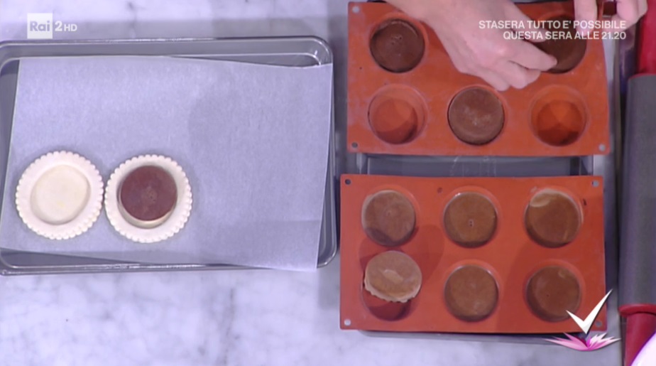 Versiamo le creme ottenute all’interno di stampini in silicone del diametro dei voulevant. Congeliamo. Inseriamo ogni dischetto all’interno di ciascun voulevant e inforniamo a 180° circa per 25-30 minuti.