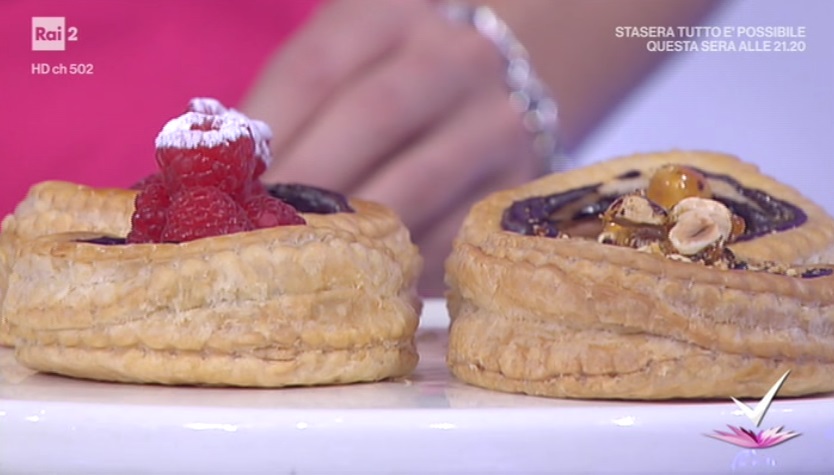 Pasta sfoglia: se vogliamo farla in casa, bisogna preparare l’impasto di farina, acqua, sale e 50 g di burro. Stendere questo composto ed inserire al centro la ‘lastra‘ di burro (400 g), quindi piegare e ripiegare più volte. Il procedimento dettagliato qui.