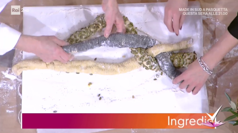 Intrecciamo i tre filoncini e richiudiamo la treccia ottenuta a corona. Incastoniamo 4 uova in 4 punti diversi e li ingacciamo con dei serpentelli d’impasto. Facciamo lievitare ancora 15 minuti almeno. Cuociamo in forno preriscaldato a 180° fino a doratura, 35-40 minuti.