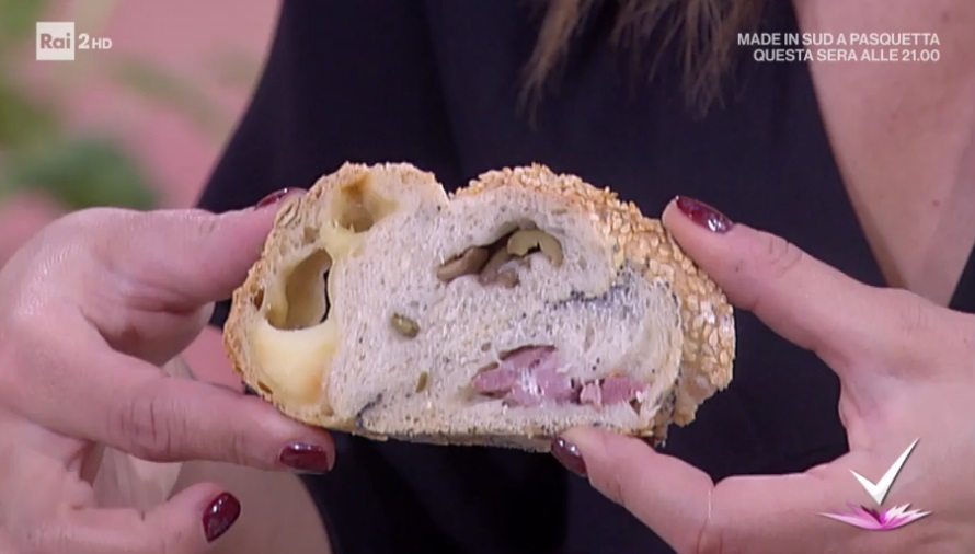 Prendiamo l’impasto e lo dividiamo in tre parti uguali. Con i tre panetti, creiamo tre lingue (prima dei salsicciotti, che allarghiamo leggermente con il mattarello). Su ognuna, quindi, disponiamo ingredienti diversi: le olive denocciolate e a pezzetti, il caciocavallo a pezzetti e la soppressata. Richiudiamo l’impasto sul ripieno, pizzicando i bordi. Spennelliamo con l’uovo sbattuto con un goccio di latte e spolveriamo ogni filoncino con semi diversi.