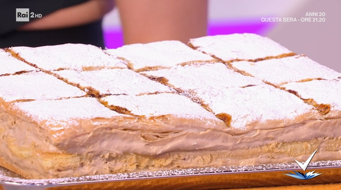 Componiamo il dolce: sul primo rettangolo di sfoglia spalmiamo un generoso strato di crema. Distribuiamo sopra delle gocce di cioccolato e sovrapponiamo un pan di Spagna spesso circa 3 cm. Lo bagniamo con la bagna al rum e spalmiamo sopra altra crema. Finiamo con un rettangolo di sfoglia e zucchero a velo. Serviamo a quadrotti.