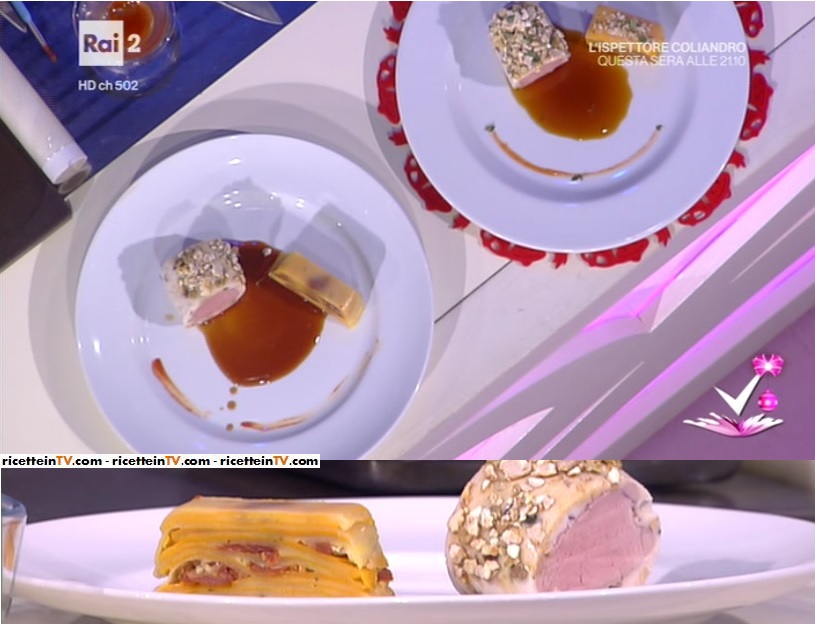 Per la millefoglie di patate e zucca: tagliamo a pezzetti il pomodoro secco. Tagliamo a fettine sottili patate e zucca. Rivestiamo uno stampo da plumcake con della carta forno. Formiamo uno strato di patate; spolveriamo con pecorino, foglie di timo e pezzetti di pomodoro secco; copriamo con altri strati di zucca e continuiamo così fino a riempire lo stampo. Pressiamo bene, copriamo con della carta forno ed inforniamo a 160° per 50 minuti. Lasciamo che raffreddi per bene, poi tagliamo a fette. Passiamo in forno prima di servire.