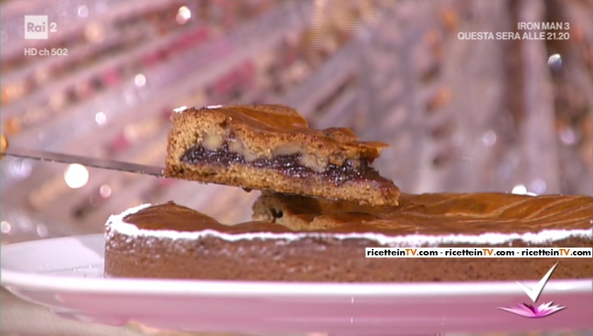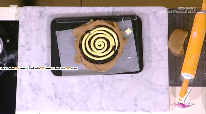 Dividiamo la frolla in due parti. Stendiamo il primo panetto ad uno spessore di 4 mm. Trasferiamo in uno stampo imburrato o all’interno di un anello. Copriamo la base con la confettura. Sopra, formiamo una spirale di crema pasticcera. Copriamo con un altro disco di frolla alta 4 mm. Spennelliamo con dell’uovo sbattuto e, con un coltellino, disegniamo sopra una griglia (senza incidere la frolla). Cuociamo in forno preriscaldato a 170° per 35 minuti circa.