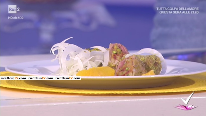 - 16 fettine di coppa di maiale da 25 l’una, 200 g pan carrè, 100 g caciocavallo, 80 g pistacchi sgusciati, 40 g pomodori secchi, 2 arance non trattate, 1 cipolla bianca, 12 foglie di alloro, sale e pepe