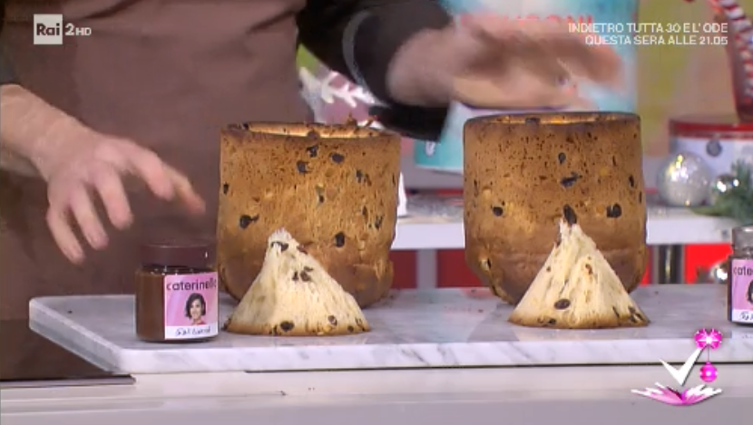 Capovolgiamo il panettone a testa in giù. Incidiamo in modo da ricavare una sorta di cono dal centro del panettone. Rimuoviamo il cono ottenuto. A parte, ammorbidiamo 1 o 2 vasetti di crema alle nocciole (tipo caterinella, qui la ricetta) al microonde o a bagnomaria e la spalmiamo all’interno dell’incavo. Spolveriamo con granella croccante, di nocciole o di mandorle tostate. Inseriamo nuovamente il cono nell’incavo. Rimettiamo il panettone in posizione normale.