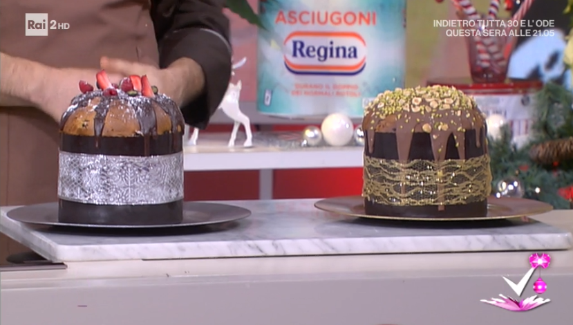 Posizioniamo il panettone su una gratella e coliamo sopra il cioccolato al latte fuso. Prima che si asciughi, lo spolveriamo con granella di nocciole e di pistacchio.