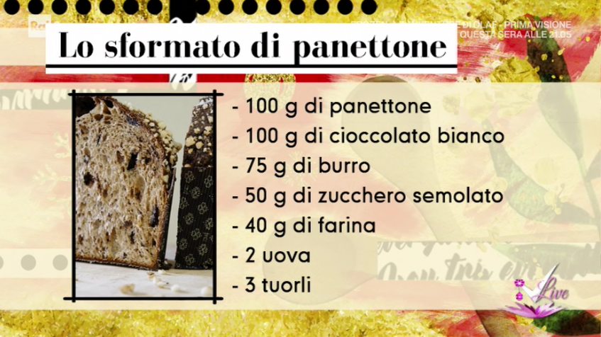 Il tutor Tommaso Arrigoni, protagonista dello spazio dedicato alla cucina, all’interno del programma condotto da Caterina Balivo su Rai2, Detto Fatto, ha dato la ricetta dello sformato di panettone. Di seguito ingredienti e procedimento.