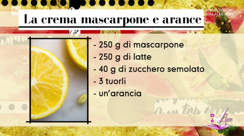 - Crema mascarpone e arance: 250 g mascarpone, 250 g latte, 40 g zucchero, 3 tuorli, 1 arancia