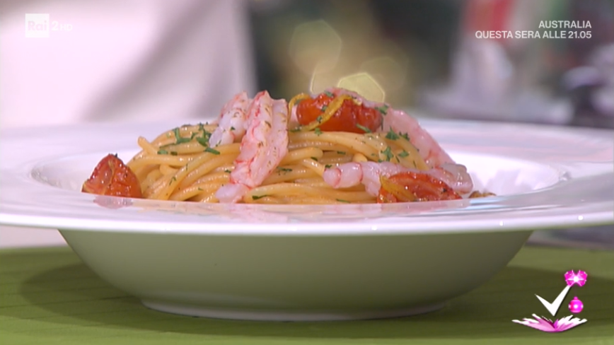 320 g spaghetti, 300 g pomodori pachino, 500 g gamberi rossi, 200 g olio evo, 200 g ghiaccio tritato, 100 g zucchero a velo, 100 g burro, 10 g timo, 1 mazzetto di prezzemolo, 1 spicchio d’aglio, 1 limone, sale e pepe