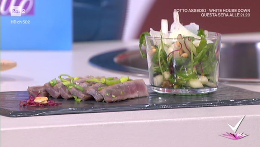 - Per l’insalata: 1 mela fuji, 1 gambo di sedano bianco, 150 g pecorino toscano, 60 g uvetta ammorbidita nel rum, 60 g pinoli tostati, 1 mazzetto di rucola, 1 cucchiaio di germogli di cipolla, sale e pepe, olio evo, succo di limone