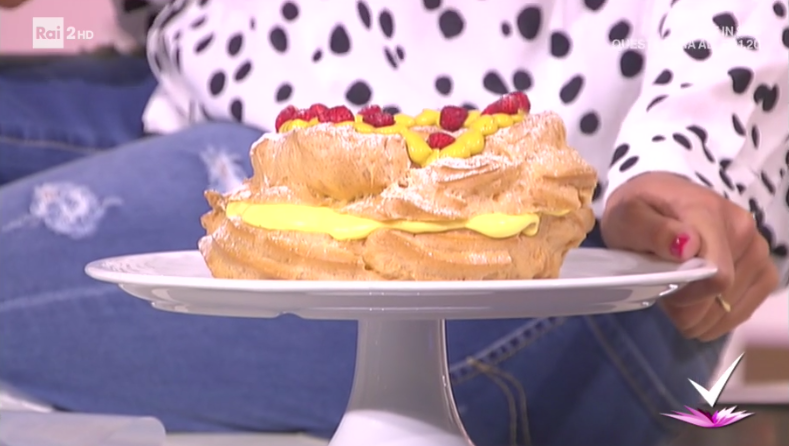 Per la pasta del bignè: portiamo a bollore l’acqua insieme al burro ed al sale. Quando il burro si è completamente sciolto e la miscela bolle, uniamo tutta la farina d’un colpo e mescoliamo energicamente. Quando l’impasto si stacca dalle pareti, togliamo dal fuoco e trasferiamo nel cestello della planetaria o in una ciotola. Lasciamo intiepidire. Uniamo le uova, una per volta, mescolando con la foglia o un mestolo. E’ possibile che servano più o meno uova: dobbiamo ottenere la consistenza di una crema pasticcera. Trasferiamo in un sac a poche. Su un foglio di carta forno, formiamo una ciambella con l’impasto, utilizzando una bocchetta 10-12 frisata (dobbiamo fare 2-3 giri). Inforniamo a 175° per 25-30 minuti. Dev’essere ben cotto o rischia di… afflosciarsi!