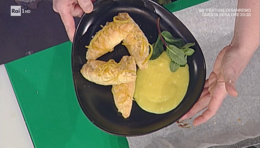 Ricaviamo 4 dischetti da un rotolo di pasta sfoglia. Su ciascun disco di sfoglia, mettiamo una cucchiaiata di polpa di limone a cubetti cotta in padella con lo zucchero. Richiudiamo a mezzaluna, come fossero dei ravioloni, pizzicando i bordi. Inforniamo a 170° per 20 minuti.