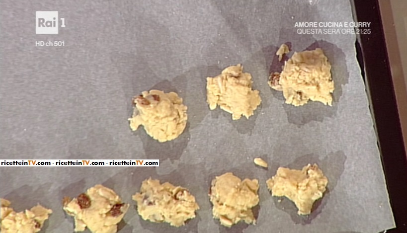 Prendiamo un bicchiere di carta per misurare gli ingredienti. In alternativa, seguite le grammature indicate sopra. In una ciotola capiente, mettiamo un bicchiere di olio di semi di mais, un bicchiere di Vin Santo o vino dolce a scelta (anche Marsala), un bicchiere di zucchero semolato, un bicchiere di uvette ammollate e ben sgocciolate. Continuiamo con mezzo bicchiere di pinoli e, infine, il lievito per dolci miscelato alla farina 00. Impastiamo il tutto con le mani. Dobbiamo ottenere un impasto della consistenza di una frolla. Su una teglia coperta di carta forno, formiamo dei mucchietti di impasto, irregolari. Come dei pizzicotti di impasto.