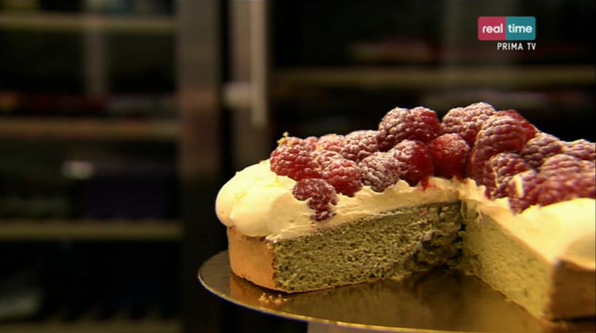 La ricetta della torta al tè verde con guarnitura al cioccolato bianco, lamponi e limoncello, proposta dal pasticcere francese Eric nel programma di Real Time “I dolci di Eric”.