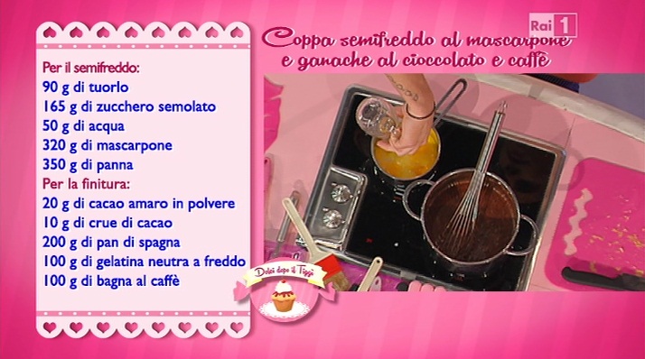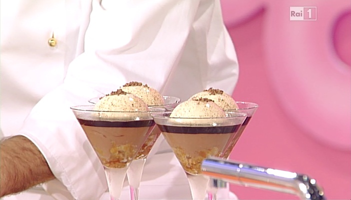 Nella puntata odierna di Dolci dopo il tiggì, il nuovo programma culinario di Antonella Clerici dedicato al momento ‘più dolce‘ del pasto, in onda subito dopo il Tg1 delle 13:30, il pasticcere Luca Montersino, protagonista della prova ‘a specchio’, ha realizzato la sua coppa semifreddo al mascarpone con ganache al cioccolato e caffè. Ecco la ricetta.