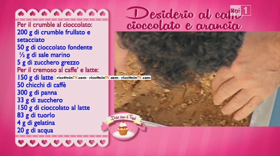 Nella puntata odierna di Dolci dopo il tiggì, il nuovo programma culinario di Antonella Clerici dedicato al momento ‘più dolce‘ del pasto, in onda subito dopo il Tg1 delle 13:30, il maestro pasticcere Sal De Riso ha realizzato il desiderio al caffè cioccolato e arancia. Ecco la ricetta.