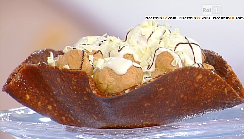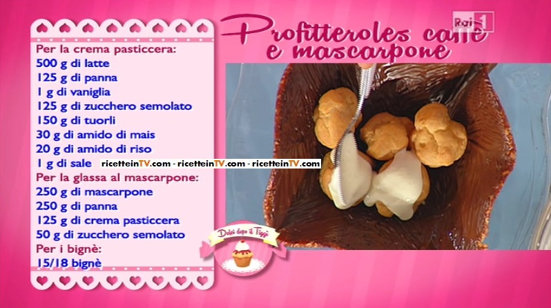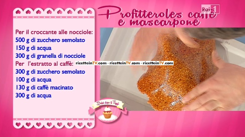 Nella puntata odierna di Dolci dopo il tiggì, il nuovo programma culinario di Antonella Clerici dedicato al momento ‘più dolce‘ del pasto, in onda subito dopo il Tg1 delle 13:30, il maestro pasticciere Pietro Macellaro ha realizzato i profitteroles caffè e mascarpone. Ecco la ricetta.