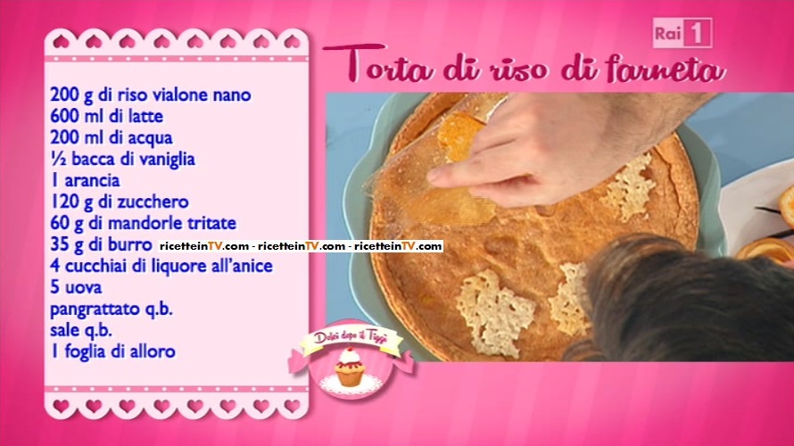Nella puntata odierna di Dolci dopo il tiggì, il nuovo programma culinario di Antonella Clerici dedicato al momento ‘più dolce‘ del pasto, in onda subito dopo il Tg1 delle 13:30, il cuoco Sergio Barzetti ha realizzato la torta di riso di farneta. Ecco la ricetta.