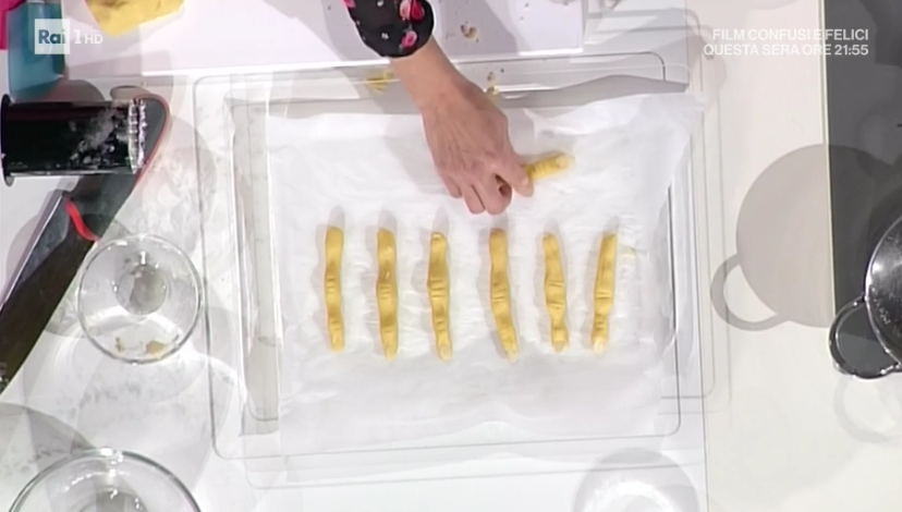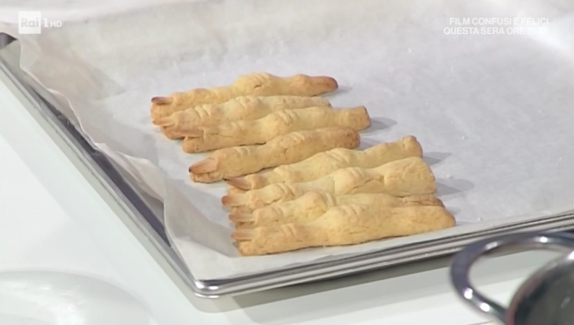 Ricaviamo delle palline di frolla. Formiamo dei serpentelli e con le dita (per definire i polpastrelli) e con un coltellino (per le rughette) diamo la forma di dita, mettendo una mandorla al posto delle unghie. Inforniamo 10 minuti circa a 180°.