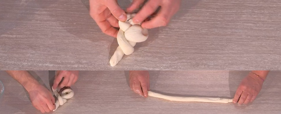 Allunghiamo ciascun panetto, fino a creare una biscia lunga circa 50 cm. La intrecciamo su se stessa (come in foto). Disponiamo gli abbracci su una teglia, distanziati, li copriamo e li lasciamo lievitare fino al raddoppio.