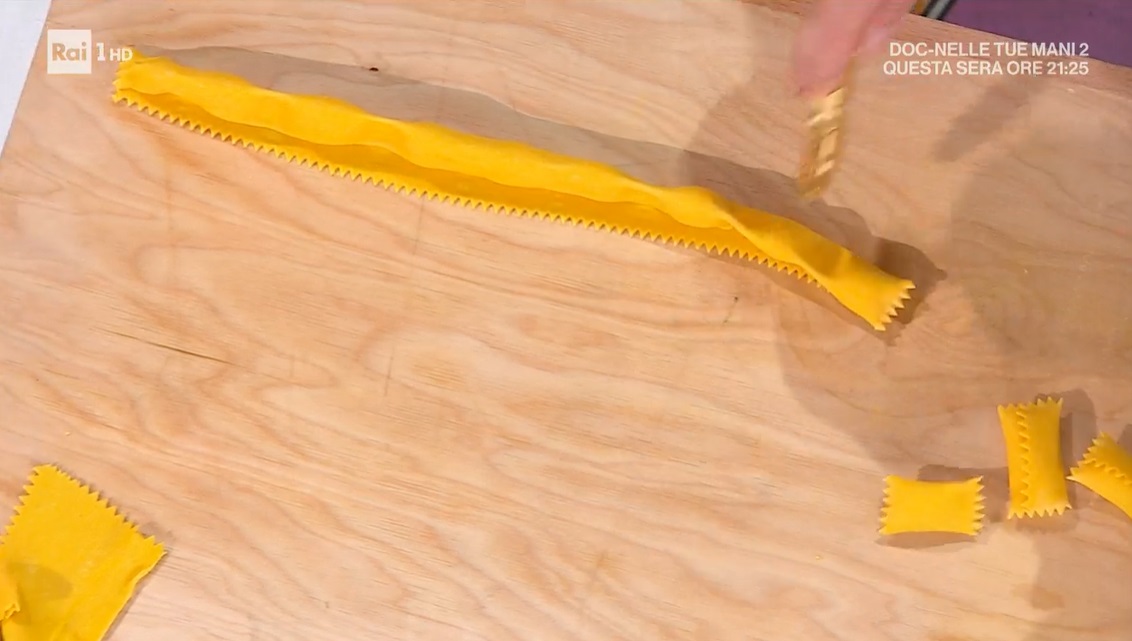 Per il ripieno amalgamiamo il formaggio spalmabile con la ricotta, un albume d’uovo e un pizzico di noce moscata. Lo mettiamo in un sac a poche e facciamo una striscia di ripieno per il lungo della sfoglia. Ripieghiamo la sfoglia arrotolandola a salsiccia e ritagliamo a pezzetti ottenendo gli agnolotti che lessiamo in acqua bollente e salata.