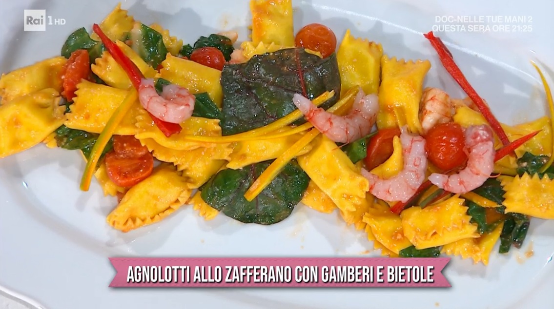 Per il sugo, in una padella scaldiamo un goccio di olio, uniamo a spadellare i gamberi puliti e sgusciati, poi uniamo i pomodorini tagliati in quattro e le bietole tagliate a pezzetti, un goccio di fondo di cottura di crostacei e lasciamo cuocere qualche istante. Scoliamo gli agnolotti nel sugo, mantechiamo e serviamo ultimando con le teste dei gamberi infarinate e fritte in olio di arachidi.