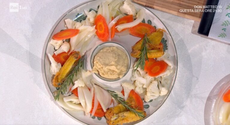 Giardiniera: scaldiamo in un pentolino l’acqua con l’aceto. Immergiamo tutte le verdure per la giardiniera tagliate a fettine ed aromatizziamo con del rosmarino. Scoliamo, lasciamo raffreddare e condiamo con olio e sale.