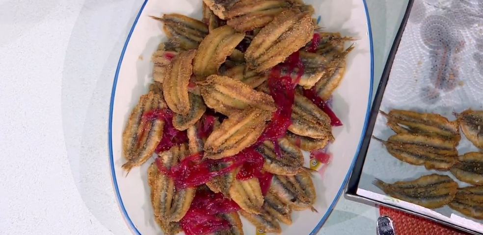 Serviamo le alici fritte con sopra la cipolla in agrodolce; possiamo creare degli strati.