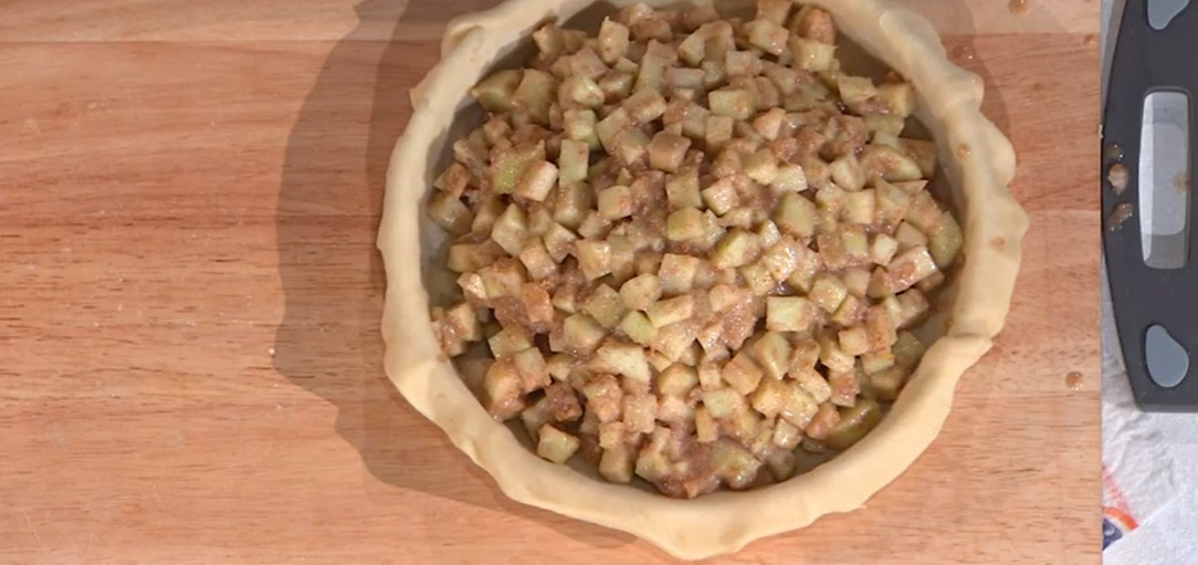 Stendiamo l’impasto in una sfoglia spessa 3-4 mm e ricaviamo 2 dischi. Inseriamo il disco più grande all’interno di una tortiera ben imburrata e bucherelliamo il fondo con una forchetta. Distribuiamo all’interno il ripieno di mele, formando una sorta di montagnetta. Copriamo con il secondo disco di impasto, schiacciamo bene, in modo da far uscire l’aria e sigilliamo bene i bordi, ripiegandoli su se stessi. Spennelliamo con tuorlo sbattuto con poca acqua, spolveriamo con lo zucchero e pratichiamo un’incisione a croce al centro. Cuociamo in forno caldo e statico a 180° per 50-60 minuti.