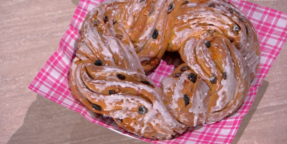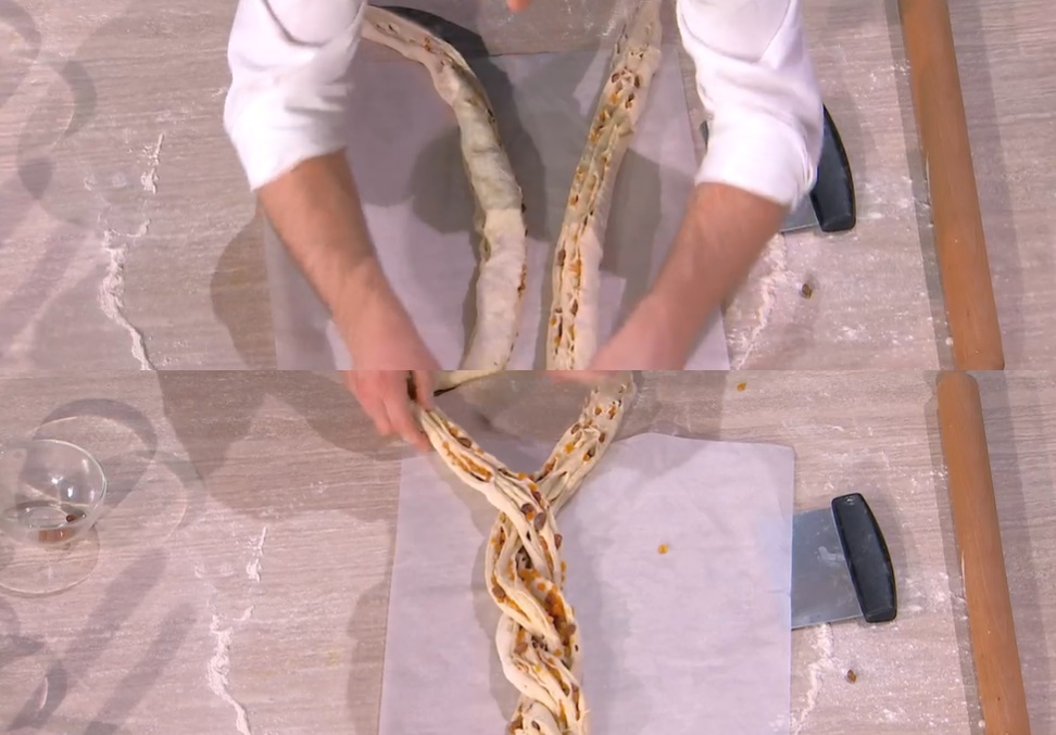 Lo posizioniamo già su un foglio di carta forno e lo tagliamo a metà per il lungo. Intrecciamo le due metà e chiudiamo la treccia ottenuta a ciambella. Posizioniamo la stessa su una teglia, copriamo e lasciamo lievitare ancora 40 minuti.