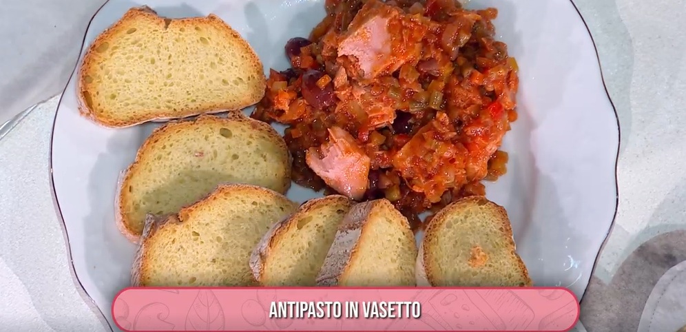 - 200 g fagiolini, 1 peperone rosso, 1 peperone giallo, 3 coste di sedano, 2 carote, 2 cipolle rosse, mezzo peperoncino, 500 g passata di pomodoro, 300 g tonno sott’olio, 100 g olive nere, 40 zucchero, 50 ml aceto bianco, olio, sale e pepe
