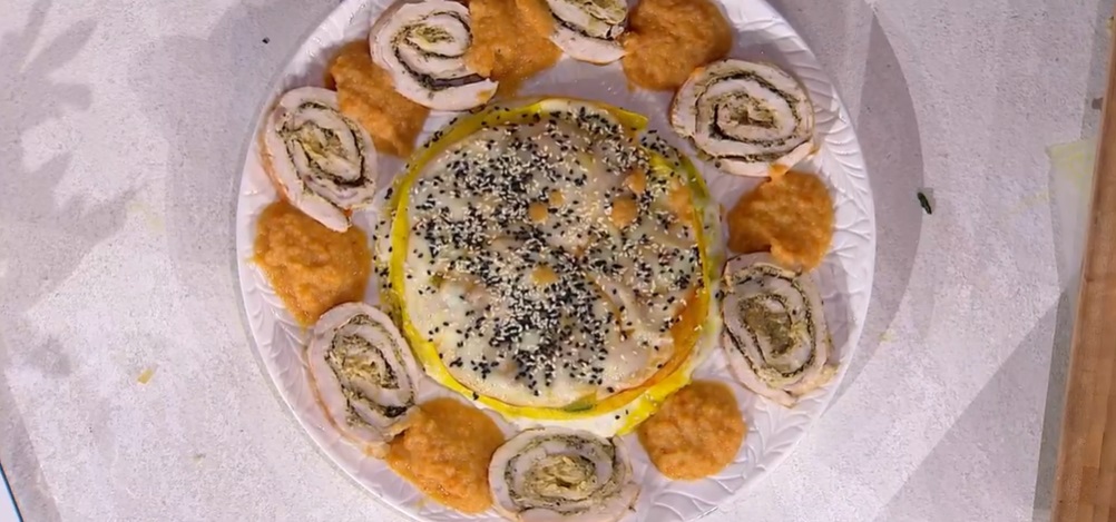 Il menu è primaverile, quasi estivo, nonostante il tempo suggerisca tutt’altro. Anche il secondo piatto di Fabio Potenzano, sull’onda dell”alleggerimento’ tanto decantato da Evelina, ci racconta della bella stagione che tarda ad arrivare. Con il cuoco siciliano prepariamo un arrosto alle erbe con millefoglie di verdura.