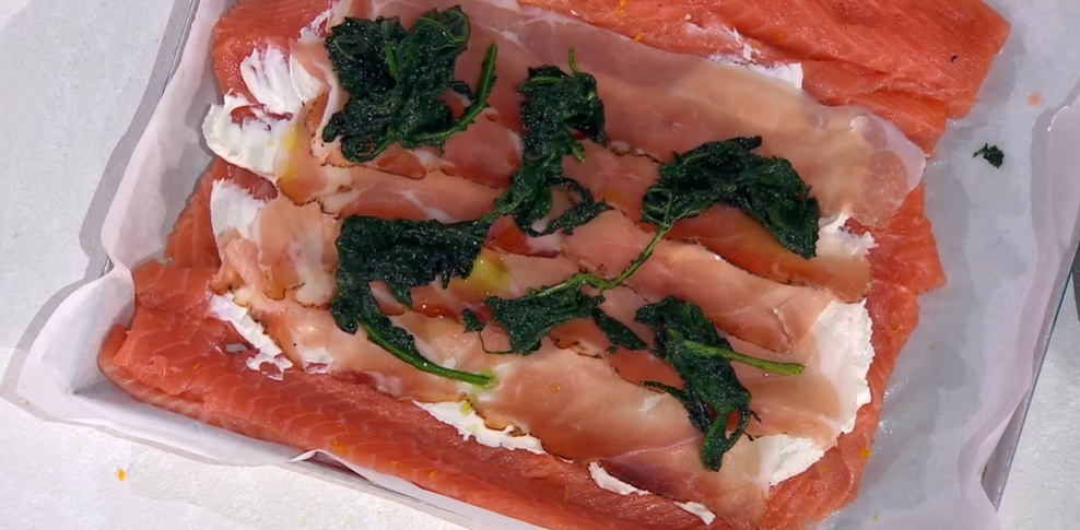 Priviamo il filetto di salmone delle lische, quindi lo apriamo a libro, in modo da ricavare un grande rettangolo. Lo posizioniamo su un foglio di carta forno e lo battiamo, in modo da assottigliarlo. Profumiamo con scorza grattugiata d’arancia, sale, pepe e spalmiamo sopra la robiola. Disponiamo sulla robiola lo speck affettato ed il cavolo nero ripassato. Arrotoliamo il salmone sul ripieno, formando un rotolo. Lo avvolgiamo stretto nella carta forno, a caramella, quindi lo leghiamo con una spago, come fosse un arrosto. Cuociamo in forno caldo a 200° per 20 minuti. Sforniamo e lasciamo riposare ancora 10 minuti avvolto nella carta.