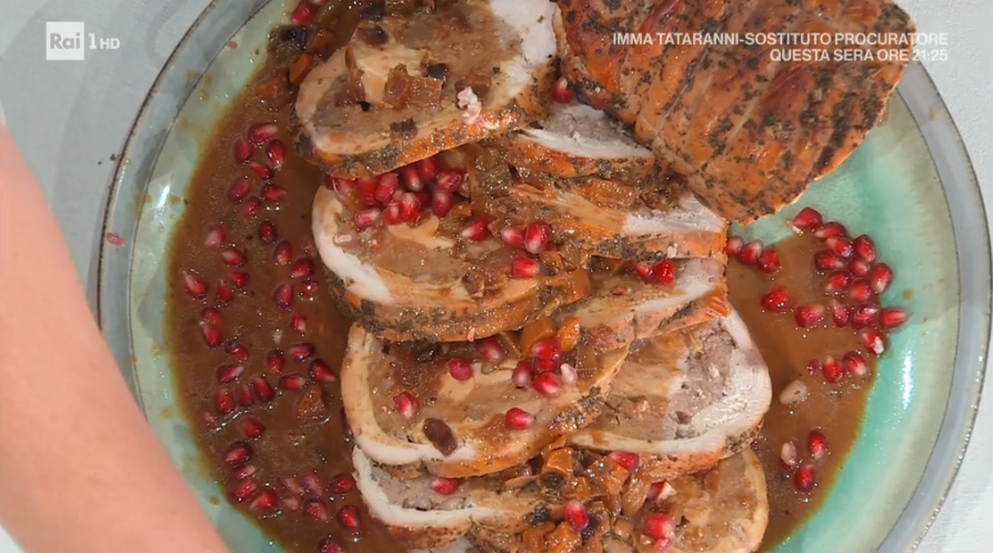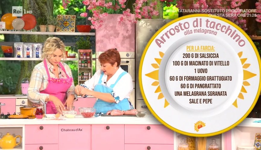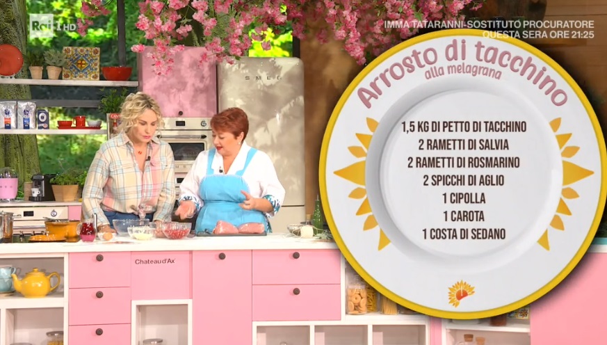 Inizio scoppiettante, in compagnia della solare zia Cri, che anche quest’oggi ci dà il buongiorno con un piatto sontuoso, un secondo piatto a base di carne. A sceglierlo, come sempre, è un telespettatore. Oggi, in particolare, un ‘amico speciale’, Marco Liorni, in collegamento dallo studio di ItaliaSi. Marco sceglie di assaggiare l’arrosto di tacchino alla melagrana.