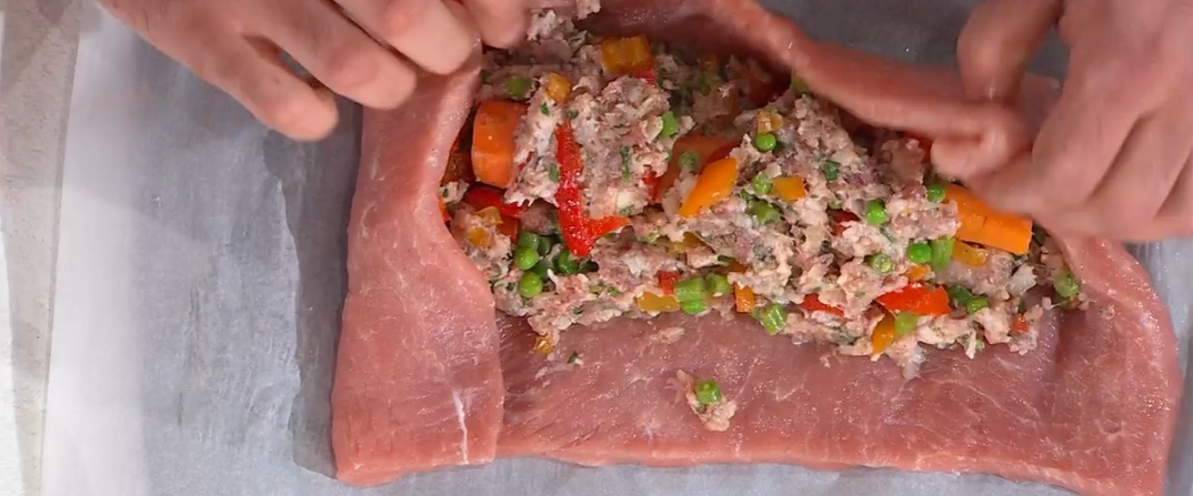 Prendiamo la lonza aperta a portafoglio, saliamo, pepiamo e posizioniamo al centro la carota lessa. Distribuiamo intorno il ripieno, quindi arrotoliamo la carne sullo stesso e la leghiamo con lo spago.
