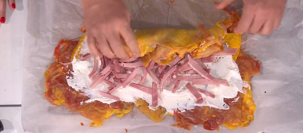 Compriamo il pollo disossato ed aperto a libro, quindi lo battiamo, in modo da assottigliarlo. Condiamo con rosmarino, sale, pepe. Adagiamo sopra la frittatina di asparagi, sulla parte centrale. Spalmiamo la ricotta sulla frittata e finiamo con sopra il prosciutto cotto a listarelle. Arrotoliamo il pollo sul ripieno, ben stretto. Lo leghiamo con lo spago, come fosse un arrosto.