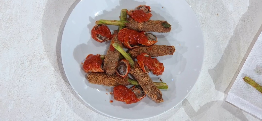 Prendiamo gli asparagi, già puliti e sbollentati, e li passiamo nell’uovo sbattuto e nel pangrattato. Avvolgiamo la punta dell’asparago nel composto di carne tritata, come fosse una polpetta, quindi passiamo ancora nelle uova e nel pangrattato. Friggiamo in olio caldo fino a doratura, rigirandoli.