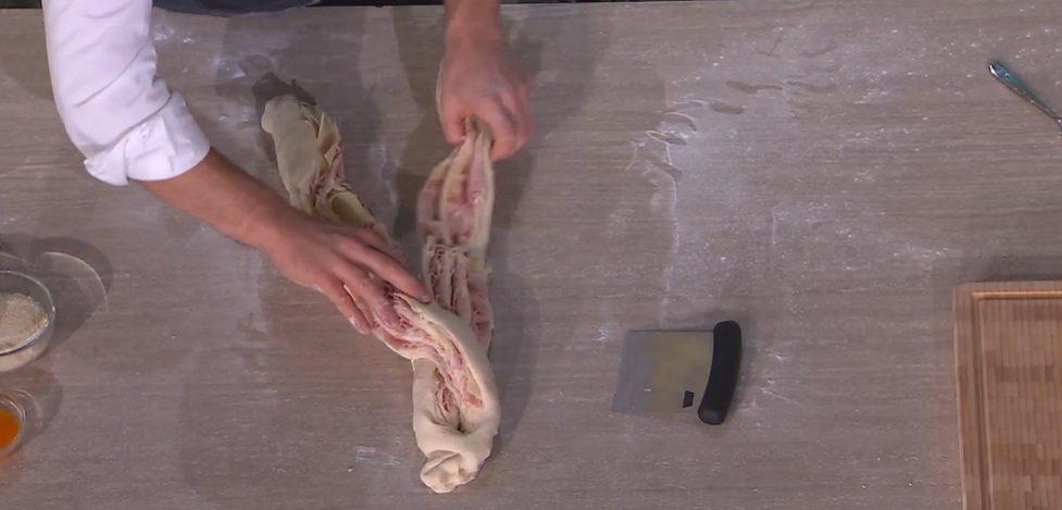 Stendiamo l’impasto sul piano, con il mattarello, in modo da ottenere un rettangolo spesso circa mezzo cm. Distribuiamo sopra i formaggi ed il prosciutto a fette, lasciando liberi 2 cm dai bordi. Arrotoliamo l’impasto sul ripieno, in modo da ottenere un salsicciotto. Tagliamo a metà quest’ultimo, per il lungo, quindi intrecciamo le due metà tra loro (foto). Inseriamo la treccia all’interno di uno stampo a ciambella ben imburrato. Copriamo e lasciamo lievitare fino al raddoppio.
